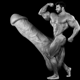 When bodybuilder Eytan Lennard came into the Cock Expansion Institute this morning, he looked fucking awesome––huge muscles, massive bulge totally hot! I was meeting with Dr Mike to discuss the recent law passed that allows our mega-hung guys––and also giga-boobed women––to go without clothes. As Peter Chaos said, " Making America Huge again!" Looking out from the conference room, I saw Peter and Dylan rub up against Eytan provocatively, and saw Eytan's swoon of instant cock growth! Eytan gained about 30 pounds of muscle from the same contact. The guys sat him down to rest after he'd finished an explosive cumshot! Then sucked him off!